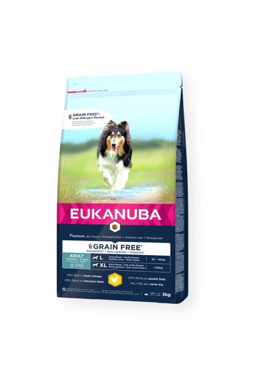 EUKANUBA Grain Free hundefôr for voksne hunder av store og gigantiske raser er rikt på fersk kylling for å støtte slanke muskler.