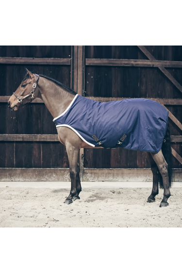 Walker Rug Waterproof er et høyytelses teppe laget av et trelags stoff. Ytterstoffet i 600D høyfast polyester er laminert med en vanntett / pustende membran og på innsiden med vårt kunstige kaninskinn. Nakke, bryst og skuldre er foret med kunstig saueskinn for enda mer komfort mens du longerer eller i rullatoren. Det kunstige kaninskinnet gir ekstra varme fordi det skaper små luftlommer som holder på kroppsvarmen til hesten. Det gir også komfort, får hestens pels til å skinne og hjelper til med å forhindre gnidning. Skuldrene er frie og teppet har en klassisk frontlukking kombinert med kraftig borrelås. Walker Rug Waterproof har to ringer for å holde det på plass, samt en nylonhalesnor festet til to D-ringer. Den har et veldig fancy utseende takket være de stilige spennene med kunstskinn og kan maskinvaskes på 30°, uten tørketrommel.