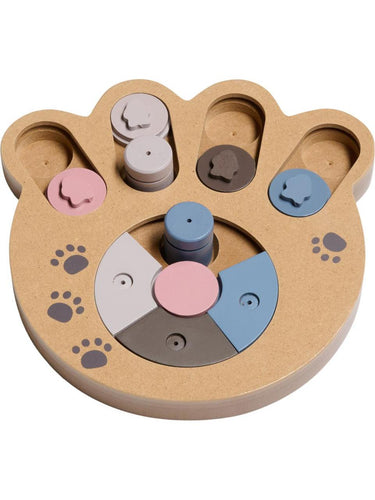Puslespill i tre for hunder er en interaktiv leke som utfordrer hundens intelligens og gir mental stimulering. Hunden må bruke nesen, potene eller munnen til å løfte, skyve eller snu deler av puslespillet for å få frem belønningen.