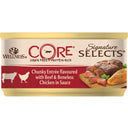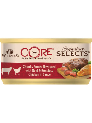 Vår Wellness CORE Signature Selects Chunky Entree med storfekjøtt og benfri kylling i saus er et komplett og balansert måltid som på en naturlig måte leverer det proteinet, den smaken og den konsistensen kjøtteteren din ønsker seg.