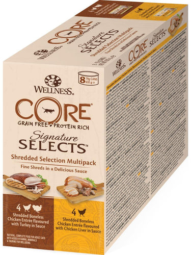 Vår Wellness CORE Signature Selects Shredded Selection Multipack er komplette og balanserte måltider som på en naturlig måte leverer proteinet, smaken og konsistensen som kjøtteteren din ønsker seg.