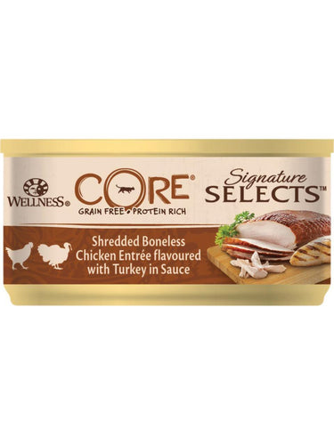 Våre Wellness CORE Signature Selects Shredded Boneless Chicken Entree med kalkun i saus er komplette og balanserte måltider som på en naturlig måte leverer det proteinet, den smaken og den konsistensen kjøtteteren din ønsker.