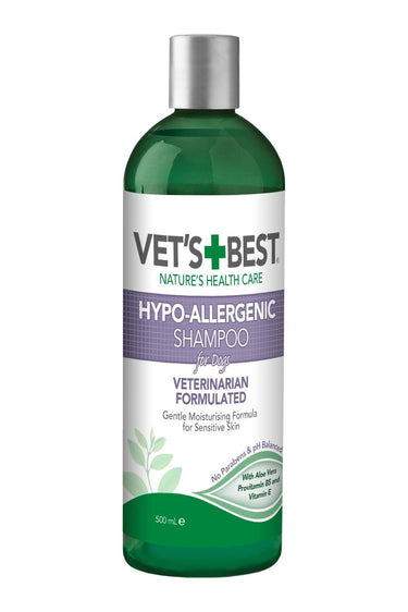 Vet´s Best Hypo-Allergenic Shampoo renser og fukter sensitiv hud, lindrer kløe og bidrar til å jevne ut tørr, sprø pels. Denne beroligende blandingen av aloe vera, allantoin og vitamin E er nøye sammensatt for raskt å pleie tørr, flassende og sensitiv hud.