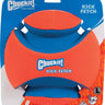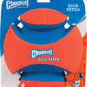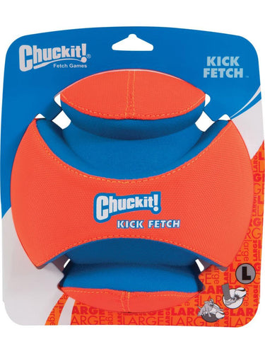 Chuckit! Kick Fetch, en stor ball designet for interaktiv lek mellom deg og hunden din. Den har en diameter på 19 cm og er laget av en kombinasjon av slitesterk gummi og skum, noe som gjør den både robust og lett. Ballens unike rilledesign gjør det enkelt for hunden å gripe og bære den. I tillegg flyter den høyt på vannet, noe som gjør den ideell for lek både på land og i vann. De livlige fargene, vanligvis oransje og blå, gir høy synlighet, selv på avstand.