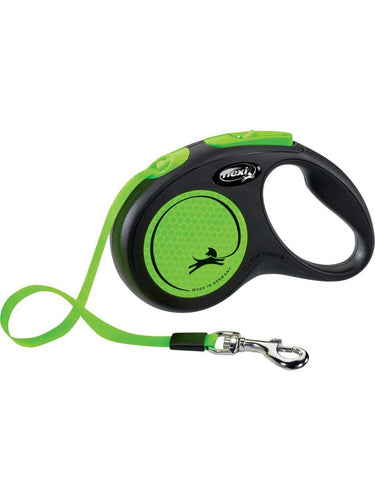flexi New Neon Flexline. Håndtakets sider er dekket med neonfargede reflekser for bedre synlighet. Forkrommet karabinkrok. Båndet er utstyrt med det patenterte enhåndsbremsesystemet, slik at du kan kontrollere hunden og justere lengden på båndet. Båndet kan utstyres med en Multi-Box for godbiter og hundeposer. Finnes for ulike hundestørrelser og med ulike snorlengder.