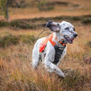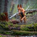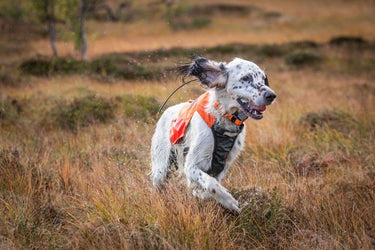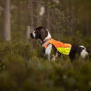 Beskyttelsesvest kan monteres på hunden din ved å justere en elastisk stropp rundt halsen og brystremmen. Bryststroppen festes med en plastspenne, skjult inne i de fargede flekkene for å unngå å bli fanget av vegetasjon. Beskyttelsesvest finnes i størrelsene XXS-XL og passer til de fleste raser som brukes til jakt.
