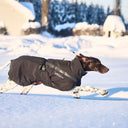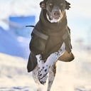 Jakkan er formet for å beskytte hundens store muskelgrupper samtidig som den tillater ubegrenset bevegelse. Benstropper holder jakken i riktig posisjon.