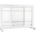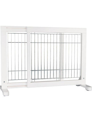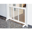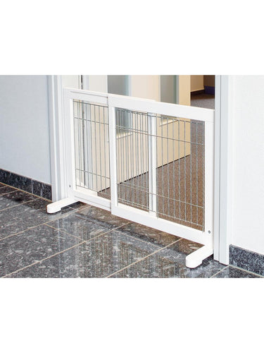 Denne hundegrinden i hvitt er designet for små og mellomstore hunder. Produktet er laget av furu og har en klarlakkert overflate, mens stengene er galvaniserte. Brukeren kan tilpasse grinden individuelt ved hjelp av variable fotposisjoner, og bredden kan justeres trinnløst. For økt stabilitet er gitteret utstyrt med sklisikre gummiføtter.