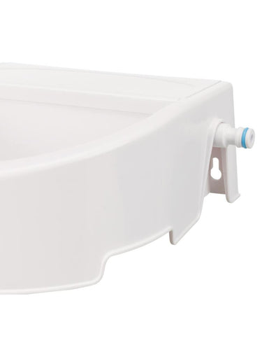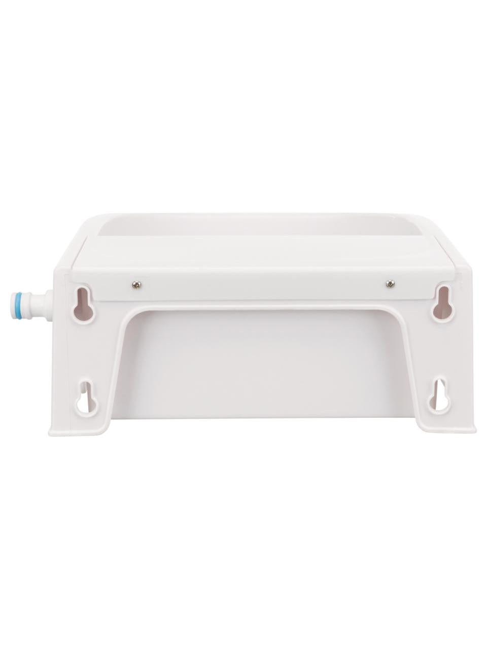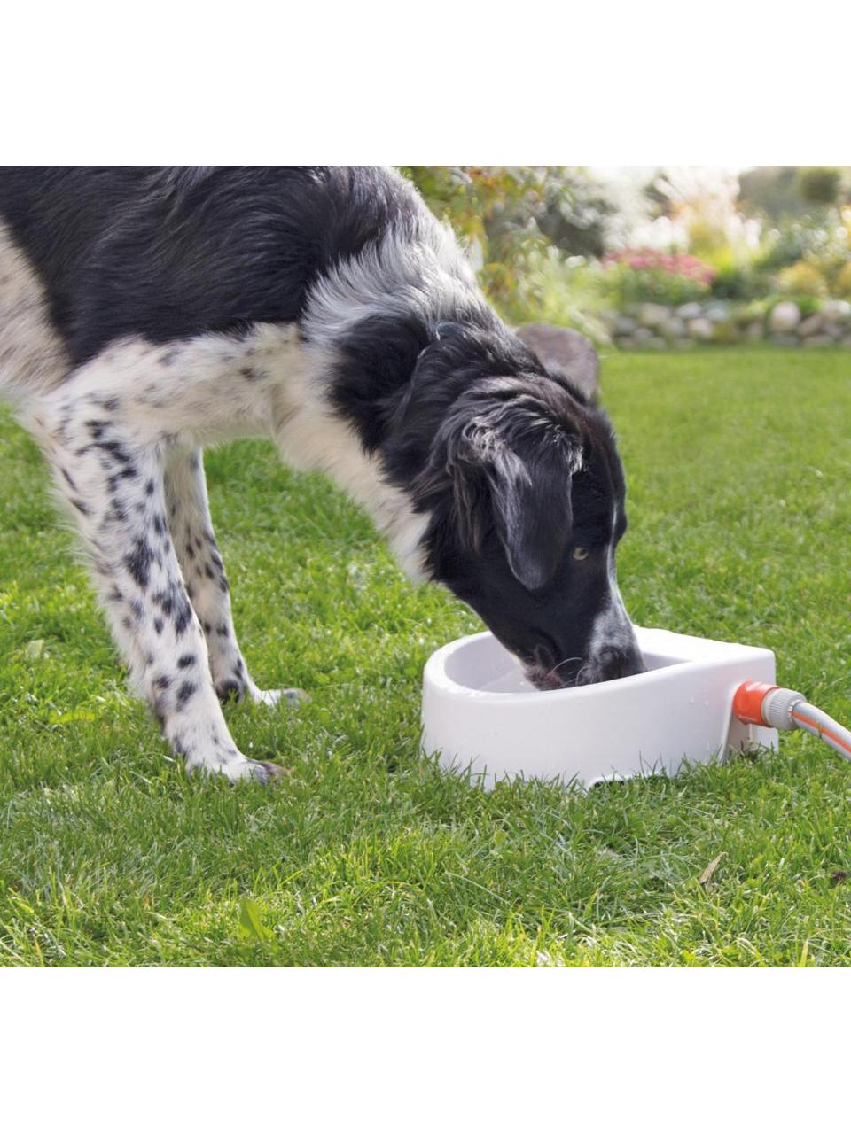 Produktet er utstyrt med en flottørventil som automatisk regulerer vannfyllingen og sørger for at vannivået holder seg konstant. Den kan kobles til en vannslange (ø 13 mm) ved hjelp av en hurtigkobling (1/2") på høyre side. Den kan plasseres stående eller hengende, monteringsmateriale følger ikke med. Vannskålen er enkel å vedlikeholde, kan tørkes av og krever verken strøm eller batterier.