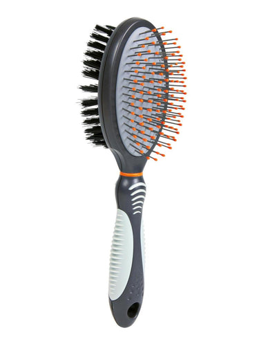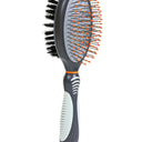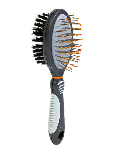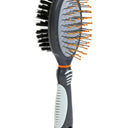 Den ene siden har nylonbust, mens den andre siden har metallbust med pigger. Nylonbørsten er perfekt til å løsne og løsne død pels og skitt, mens metallbørsten med pigger er effektiv til å fjerne løse hår og nå dypere inn i underpelsen. Plasthåndtaket med gummigrep gir et komfortabelt og sikkert grep under bruk.