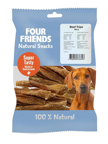 FourFriends Natural Snacks er et populært naturlig godteri fra Sveits. Beef Tripe er laget av muskelveggen fra de tre første kamrene i en kus mage. Fungerer perfekt som et sunt mellommåltid og ekstra utmerket ved urolig mage. Tyggemotstanden bidrar til økt tannhelse.