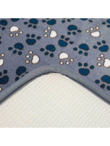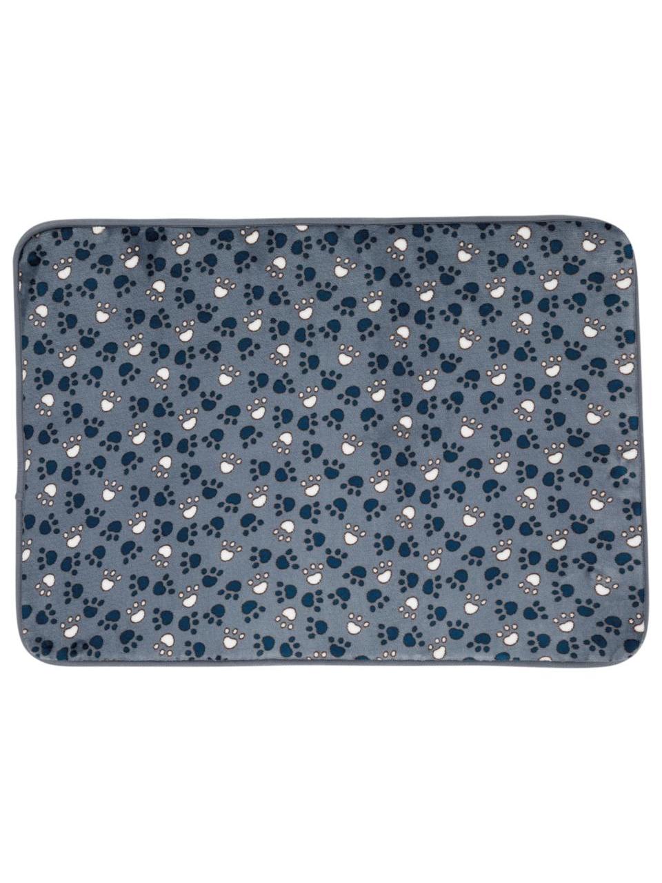 Design: Blått teppe med søtt poteavtrykk-mønster som passer inn i de fleste hjem.