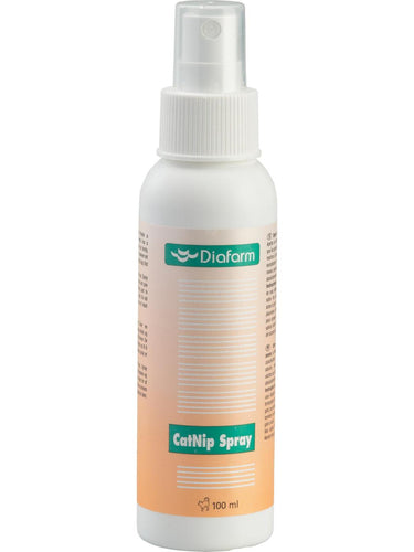Diafarm CatNip spray 100 ml. Gir en særegen duft som har en spesiell effekt og fascinasjon på kattefamilien, spesielt hannkatter. De fleste voksne katter, unntatt kattunger opp til 6 måneder, vil finne Diafarm Catnip spray uimotståelig. Bruksanvisning: Rist før bruk. Spray på leker og katteseng for å tiltrekke og glede katten. Spray på klorestativet for å motivere katten til å bruke det. Ikke spray direkte på dyrene. Oppbevares utilgjengelig for barn.