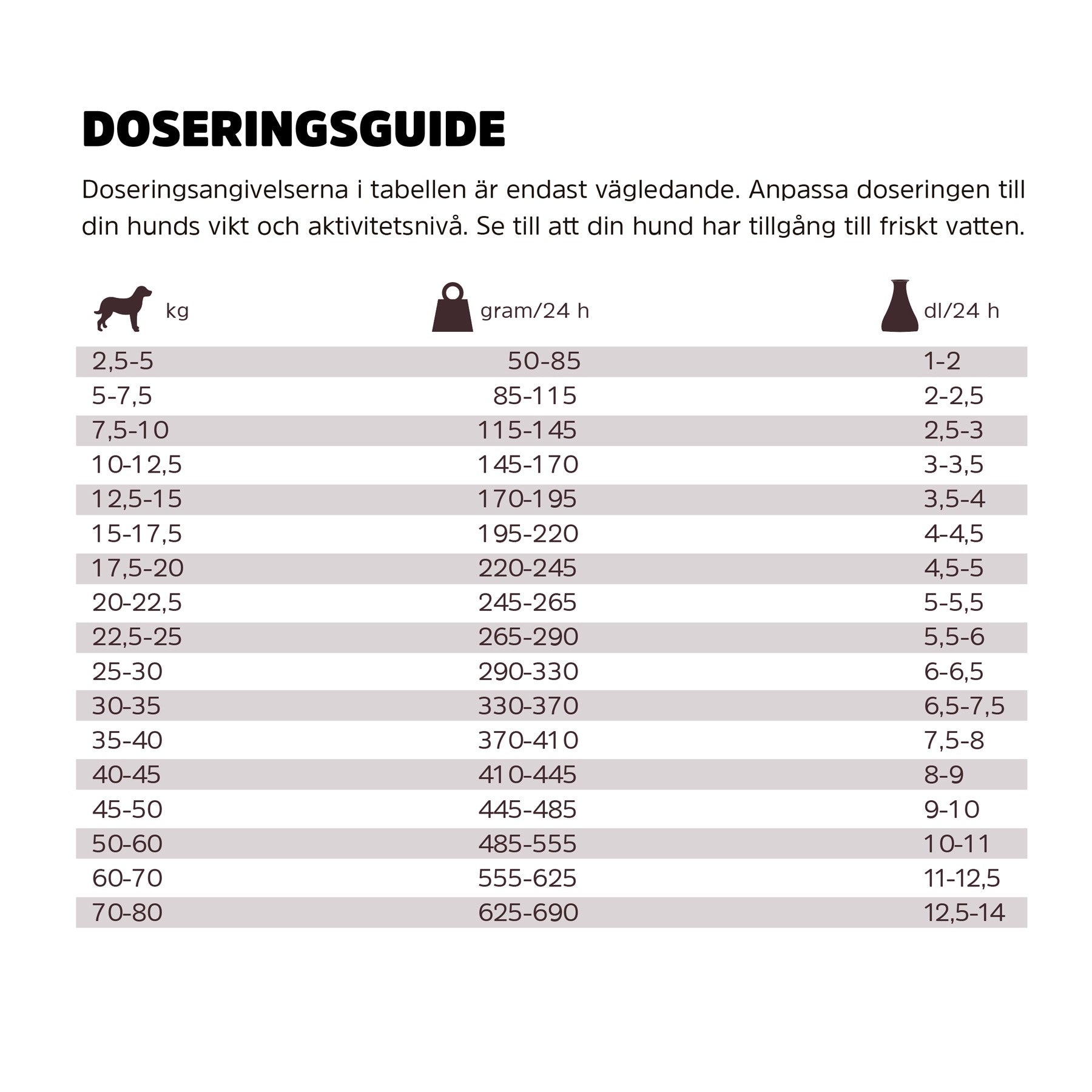 - Helt kornfri - gjør fôret lettfordøyelig og passer derfor for hunder med sensitiv mage.