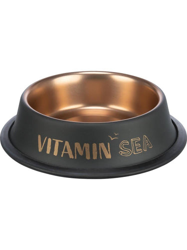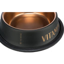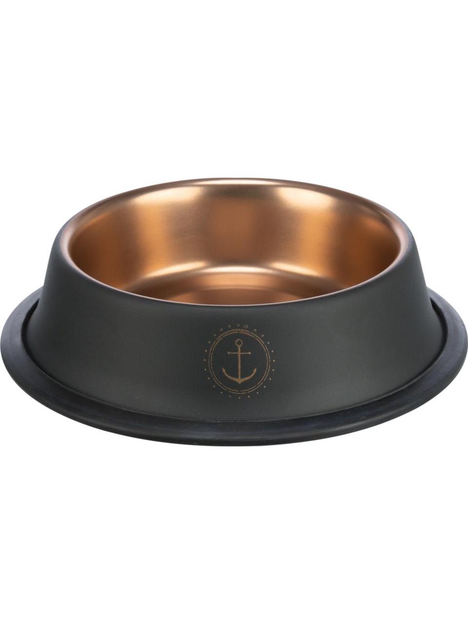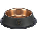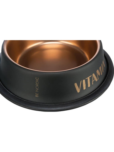 BE NORDIC-skålen kombinerer rustfritt stål med en svart og bronsefarget finish for et elegant utseende. Skålen er designet for å være sklisikker takket være en gummiring i bunnen, noe som sikrer stabilitet under bruk. Skålen er lakkert for å øke holdbarheten og det estetiske uttrykket. Med sin stilige design og praktiske funksjoner er denne skålen en ideell løsning for hundens måltider.