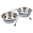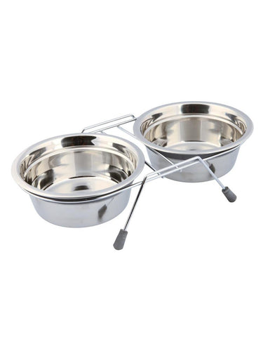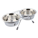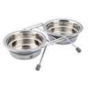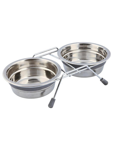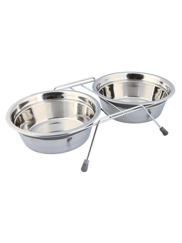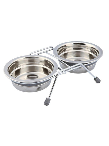 Dette skålesettet, kalt Eat on Feet, er en elegant og praktisk løsning for fôring av kjæledyr. Settet består av to stålskåler montert på en metallholder som er forkrommet for et stilig utseende. En spesiell egenskap er den innebygde skranglebeskyttelsen som reduserer støynivået under bruk takket være de medfølgende silikonringene. I tillegg er skålene sklisikre takket være silikonføttene som forhindrer at de sklir under måltidet. Alle skålene tåler oppvaskmaskin, noe som gjør rengjøringen rask og enkel.