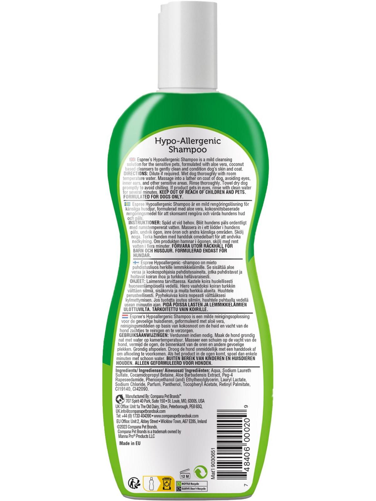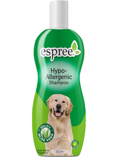 Denne milde sjampoen er laget uten tilsetningsstoffer og fargestoffer, noe som gjør den egnet for selv de mest følsomme hundene. Espree Hypo-Allergenic Shampoo har en mild og beroligende formel som skånsomt rengjør pelsen og huden uten å irritere eller tørke den ut. Den er beriket med pleiende ingredienser som aloe vera og kamille som lindrer kløe og beroliger irritert hud. Den etterlater også en mild og behagelig duft. Espree Hypo-Allergenic Shampoo er enkel å bruke. Det er bare å fukte pelsen med vann, massere sjampoen inn i pelsen, skumme godt og skylle grundig. Den milde formelen sikrer at den ikke irriterer øynene eller huden, og kan brukes regelmessig uten å tørke ut huden.