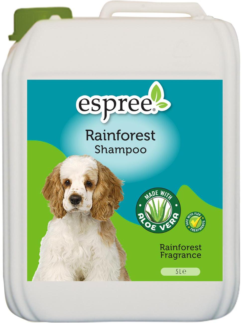 Esprees Rainforest Shampoo er en velduftende sjampo som passer til de fleste pelstyper. Dyprensende formel med aloe vera gir glansfull pels. Brukes sammen med Espree Rainforest Conditioner for best resultat. Sjampoen dufter av regnskog.