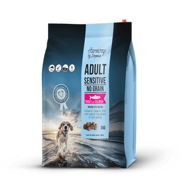 Harmony Adult Sensitive - Et næringsmessig balansert premiumfôr med fisk for voksne hunder av alle raser. Da fôret er mildt og skånsomt, passer det godt til hunder med følsom mage. Fôret inneholder naturlige råvarer, superfoods og fersk fisk, som øker smakeligheten og kan påvirke fordøyelsen positivt. Vi ønsker å gi hunden din en god matopplevelse som også gjør godt for magen. Harmony Adult Sensitive inneholder alt hunden din trenger uten unødvendige tilsetningsstoffer som soya, fargestoffer og smakforsterkere. Harmony gir hunden din en god magefølelse! Størrelsen på fôrpelleten: ø 10x12mm