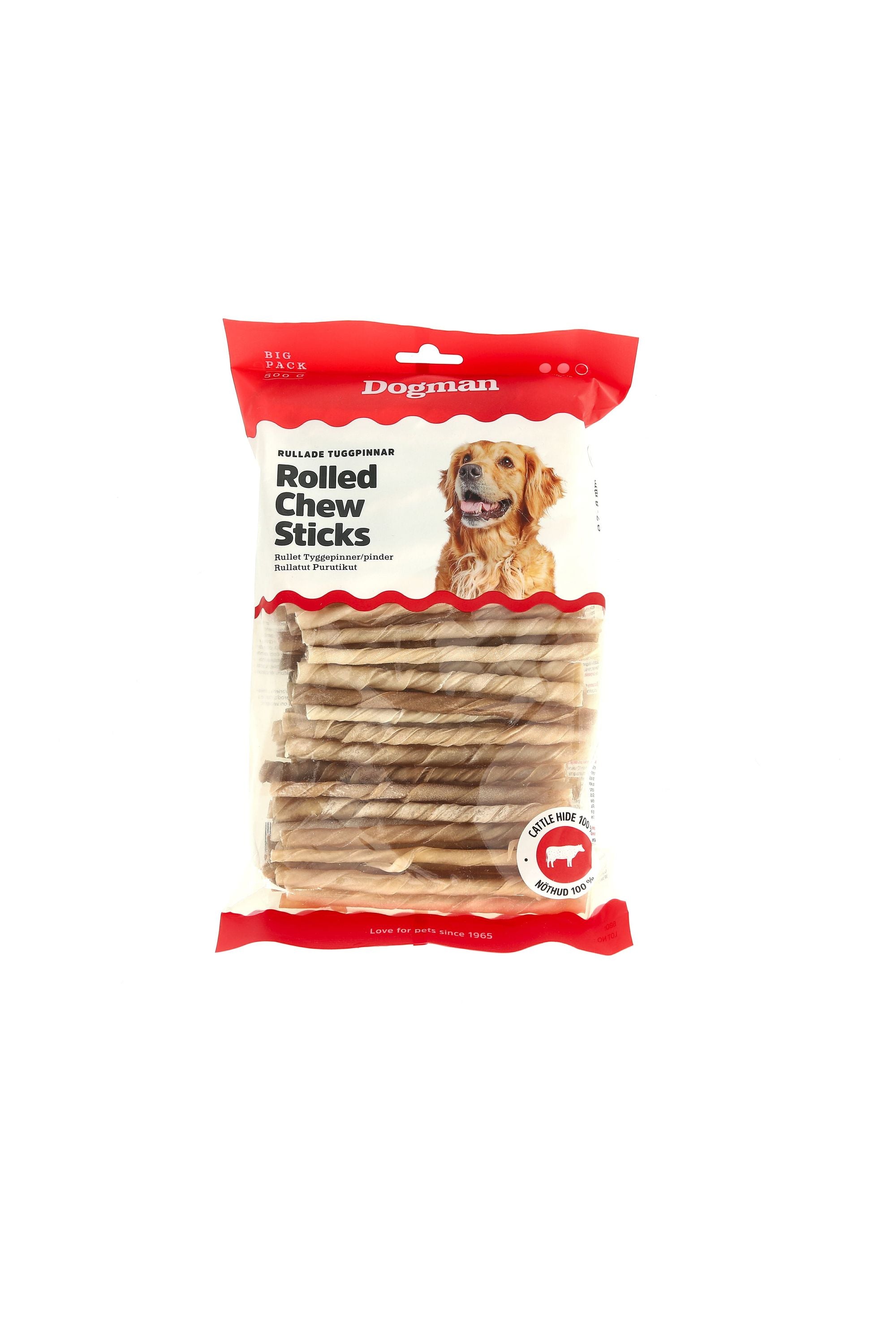 Naturlige tyggepinner av høy kvalitet laget av ubehandlet og rullet råhud. Forlenger tyggetiden, dekker behovet for tygging og bidrar til en sunn tannhelse. Hold alltid hunden under oppsyn når den tygger på tyggeben.