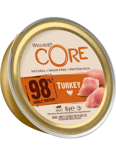 CORE CAT 98 %* kalkun er en deilig oppskrift som gir katten din et 100 % naturlig, komplett og balansert måltid. Laget med mer enn 98 % kalkun fra én enkelt proteinkilde, ideelt for katter som er følsomme for mat. En deilig og velsmakende paté som sørger for at katten din får den næringen den trenger for å trives fra CORE.