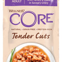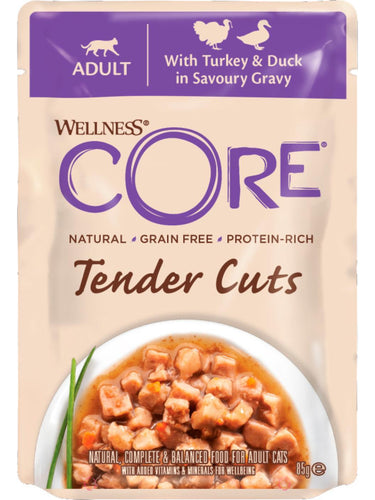 Med smak i tankene, men helse i hjertet: Våre Wellness CORE Tender Cuts med kylling og kalkun i smakfull saus er kornfrie, naturlig langtidsstekte, møre stykningsdeler av fjærkre kombinert med sunne grønnsaker og frukt servert i smakfulle sauser som gir en uimotståelig smak.