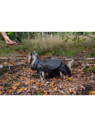 De to justerbare elastiske stroppene på innsiden av baksiden av jakken sikrer en sikker passform som holder seg på plass, uansett hvor aktiv hunden din er.