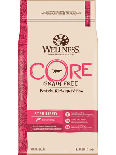 Wellness CORE Sterilised Ocean med laks er utviklet for å dekke behovene til steriliserte katter og bidrar til sunn hud og blank pels takket være garanterte omega 3- og 6-fettsyrer fra lakseolje.