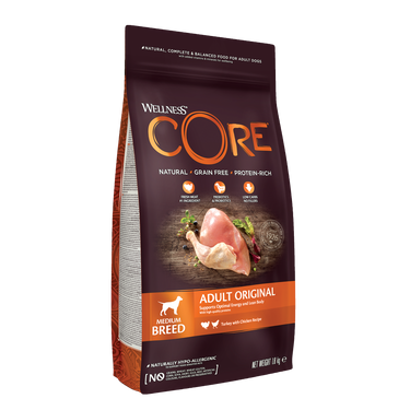 Kornfri og proteinrik, vår Wellness CORE Adult Original har fersk kalkun som hovedingrediens. En naturlig oppskrift med kjøttproteiner av høy kvalitet, sammen med en unik blanding av sunne grønnsaker og supermat, uten fyllstoffer og korn. Wellness CORE Original støtter naturlig opp om sunn energi og slanke muskler.