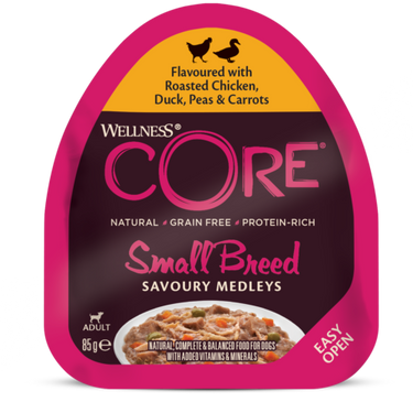 Wellness CORE Small Breed Savoury Medleys er naturlige, komplette og balanserte måltider med deilig smak og spennende konsistens, spesielt utviklet for hunder av små raser. Beriket med vitaminer og mineraler.