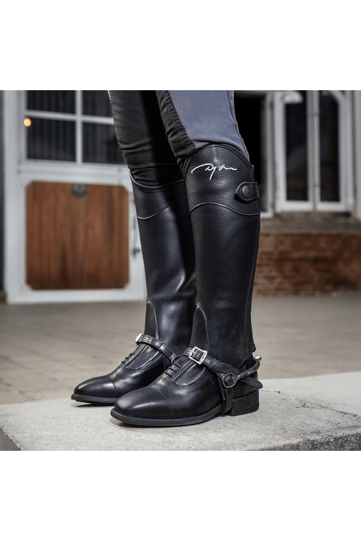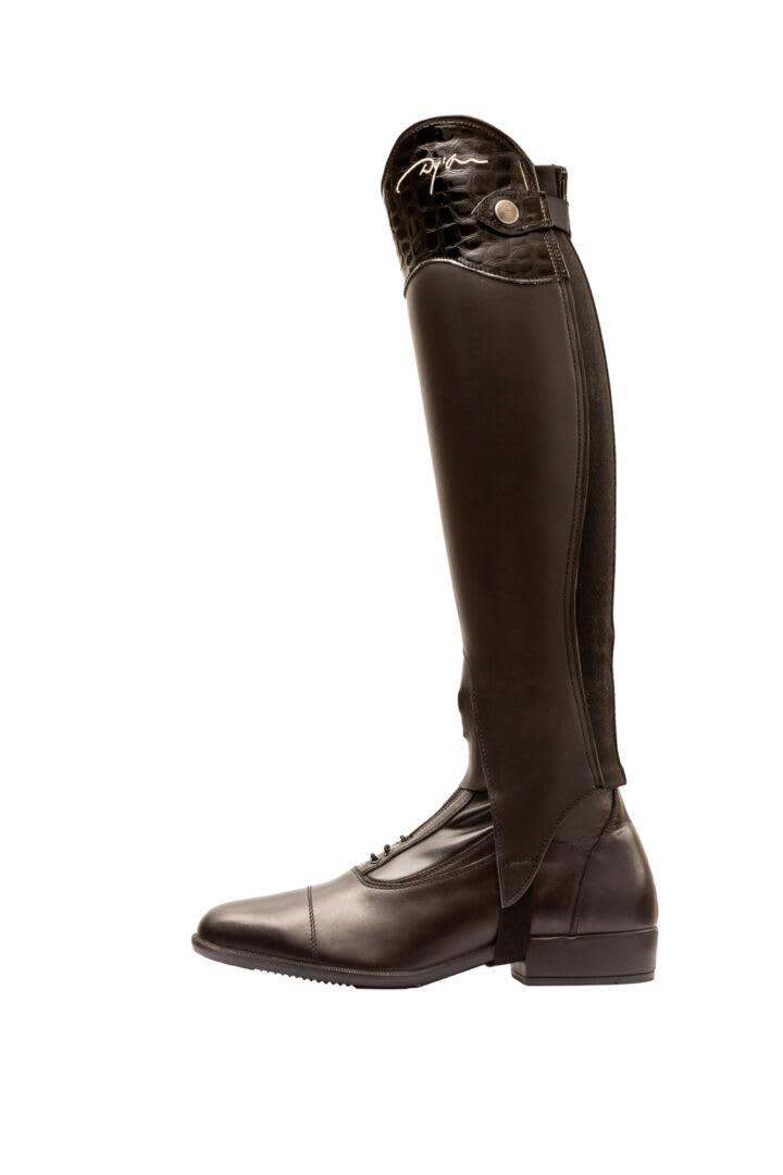 Toppen av chapsene har brodert Dyon-logo og kan leveres i enten preget lær eller blank, imitert krokodilleskinn. Exel half chaps kommer i standardstørrelser og matcher perfekt til både trening og konkurranse.