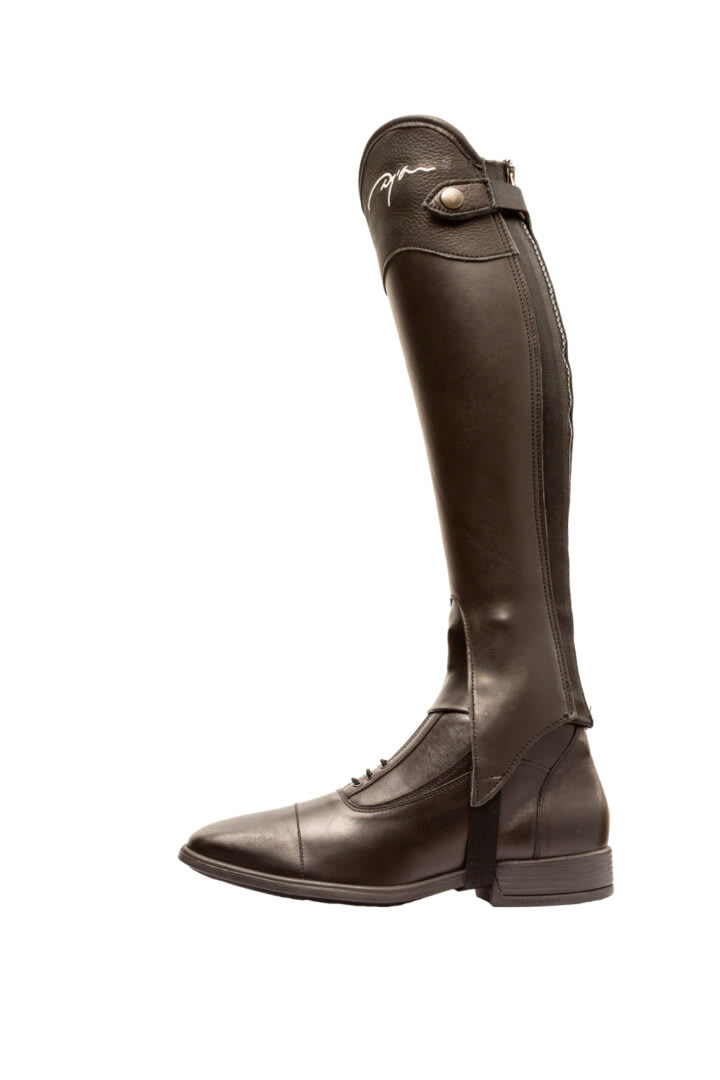 Exel half chaps er laget i glatt kalveskinn med en tykkelse på 1,8 mm og er utviklet for ryttere som ønsker optimal passform og bevegelsesfrihet. En slitesterk YKK-glidelås i nylon, kombinert med en elastisk stripe bak på leggen, sikrer tett og komfortabel passform. Det unike snittet med elastisk kile over vristen, elastisk stropp under kneet og elastikk under foten gir maksimal bevegelse og støtte.