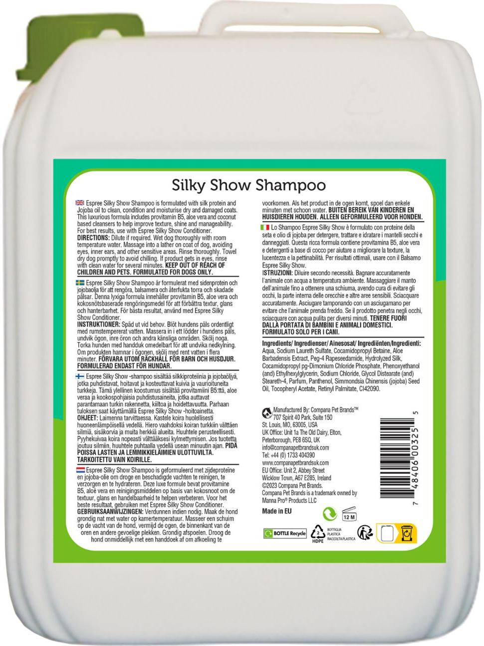 Sjampoen er formulert med nøye utvalgte ingredienser, blant annet silkeproteiner og aloe vera, som sammen renser, pleier og styrker pelsen. Silkeproteinene trenger dypt inn i hårstråene og etterlater dem glatte og blanke, mens aloe vera gir fuktighet og beroliger huden. Sjampoen har en mild og skånsom formel som passer for alle hunderaser og hudtyper. Den rengjør pelsen effektivt uten å fjerne de naturlige oljene som er avgjørende for en sunn og velstelt pels. Den har en behagelig duft som gir hunden en frisk følelse. Enten hunden din konkurrerer på utstilling eller bare nyter en grundig og skånsom rengjøring hjemme, vil Espree Silky Show Shampoo etterlate hundens pels vakker og velstelt.