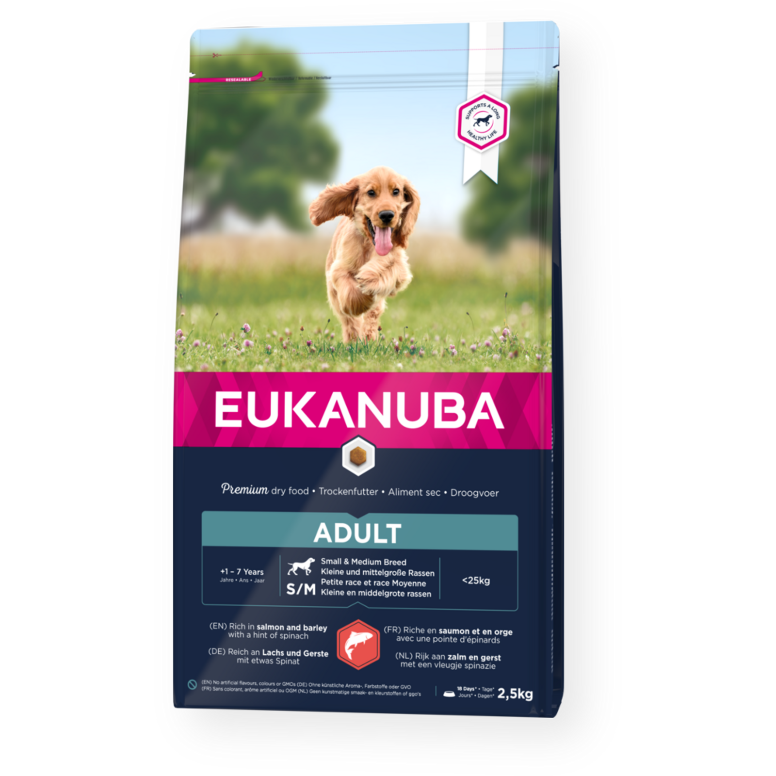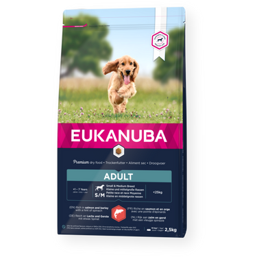 Fôret er 100 % komplett og balansert. Eukanuba inneholder rikelig med laks og bygg og er ideelt for voksne hunder av små og mellomstore raser som dachshund, collier, mops og cocker spaniel.