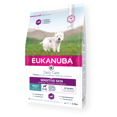 Eukanuba Daily Care tørr hundemat for sensitiv hud – formulert for å begrense ingredienser som kan forårsake kløe.
