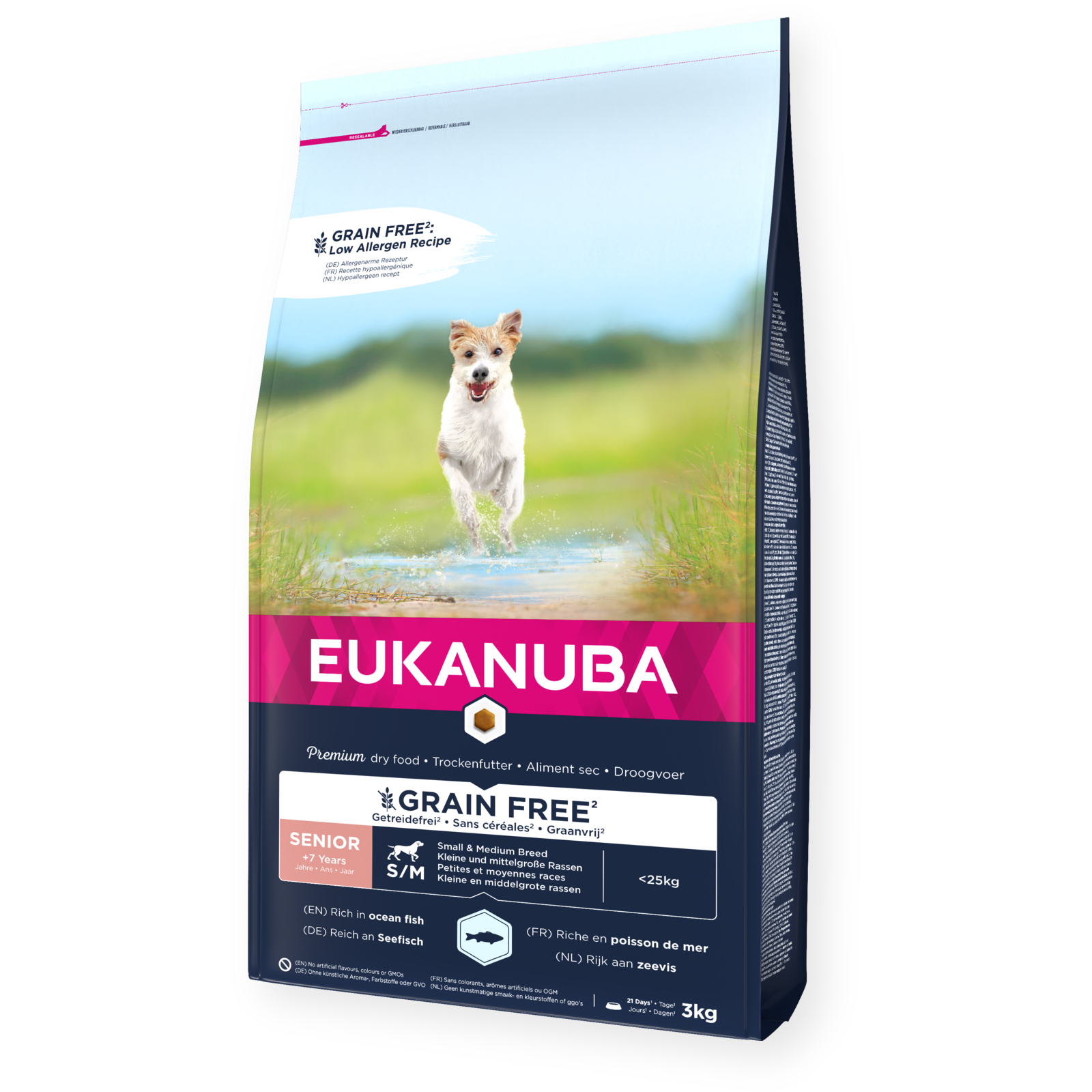 EUKANUBA kornfritt tørrfôr til eldre hunder av små og mellomstore raser, rikt på havfisk er en lavallergen oppskrift som er nøye utviklet for å unngå vanlige allergener.