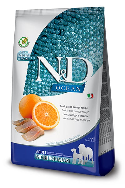 Oppskrift med sild og appelsin. N&D Herring & Orange er et komplett tørrfôr for voksne hunder, utviklet for å gi optimal ernæring som støtter hundens naturlige behov som kjøttetende dyr. Dette premiumfôret er en del av N&D Prime – Ernæringssystem for karnivorer, med nøye utvalgte ingredienser for smak og helse.