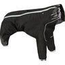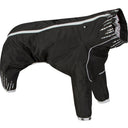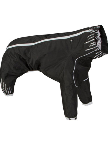 Overallen har en høy krage og en regnfelle i kragen som hindrer regn i å trenge inn i overallen. Produktet er laget av slitesterkt og komfortabelt fleksibelt utendørsstoff som ikke rasler når hunden beveger seg.