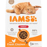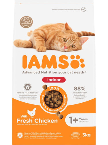 IAMS for Vitality Indoor for voksne og eldre katter er et komplett, ferskt kyllingfôr med 100 % balansert ekspertnæring som kjæledyret ditt vil like og trives med. Dette smakfulle voksenfôret inneholder 14 % mindre fett enn IAMS med fersk kylling for voksne katter og passer for alle innekatter. IAMS for Vitality Indoor bidrar også til å redusere lukt i kattedoen og dannelse av hårballer.