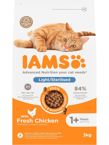 IAMS for Vitality Light in fat / Sterilisert kattemat med fersk kylling for voksne og eldre katter er et 100 % komplett og balansert fôr utviklet av eksperter med fersk kylling som fremmer kattens helse og vitalitet på 7 områder og hjelper katten din med å holde vekten. Du finner alt i denne smakfulle oppskriften med 84 % animalsk protein (av det totale proteininnholdet) som kjæledyret ditt kan nyte hver dag.