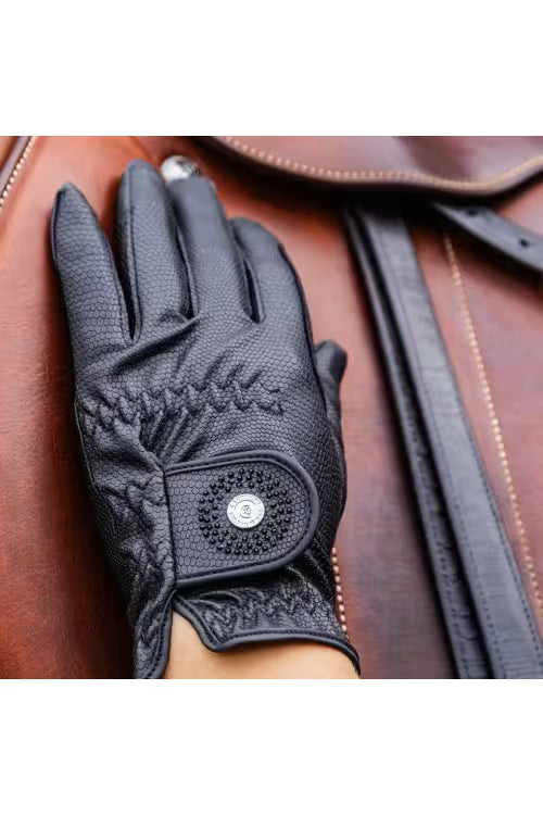 En perfekt kombinasjon av eleganse, grep og slitestyrke – disse ridehanskene er utviklet for ryttere som stiller høye krav til både stil og ytelse. Med et ytre materiale i et sofistikert øglemønster gir de utmerket grep på tøylene, samtidig som de beholder høy komfort og fleksibilitet. Kombinasjonen av nylon og polyuretan sikrer lang levetid, god pusteevne og presis fingerfølelse. Som en ekstra detalj er borrelåslukkingen avsluttet med en diskret glittereffekt som gir et raffinert løft til helheten.