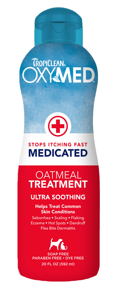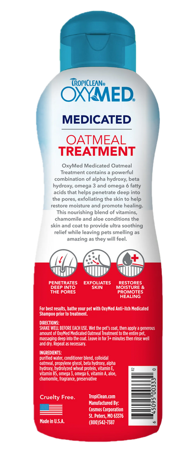 OxyMed Medicated Oatmeal Treatment inneholder en kraftig kombinasjon av Alpha Hydroxy, Beta Hydroxy, omega 3- og 6-fettsyrer som hjelper til med å trenge dypt inn i porene og eksfoliere huden for å gjenopprette fuktighet og fremme helbredelse. Denne nærende blandingen av vitaminer, kamille og aloe vera pleier huden og pelsen, gir beroligende lindring og får kjæledyrene til å dufte like fantastisk som de føler seg.