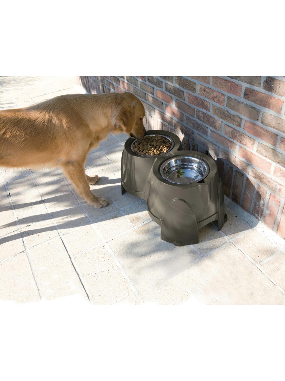 Ergo feeder: Ergonomisk spise- og drikkestasjon for store hunder. I plast med to skåler i rustfritt stål. Mål: 49 x 28 x 18 cm / 0,8 l