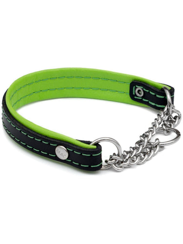 Skinnhalsbånd halvstrup med kjetting, i svensk vegetabilsk garvet skinn av høy kvalitet og fri for ftalater. Foret med slitesterkt kunstlær i samme farge som sømmene. Størrelsen refererer til maksstørrelsen, den minste størrelsen er ca 10 cm mindre.