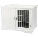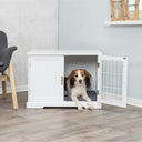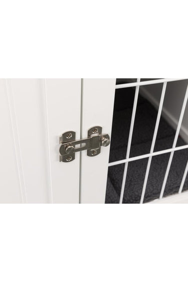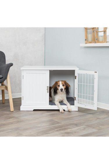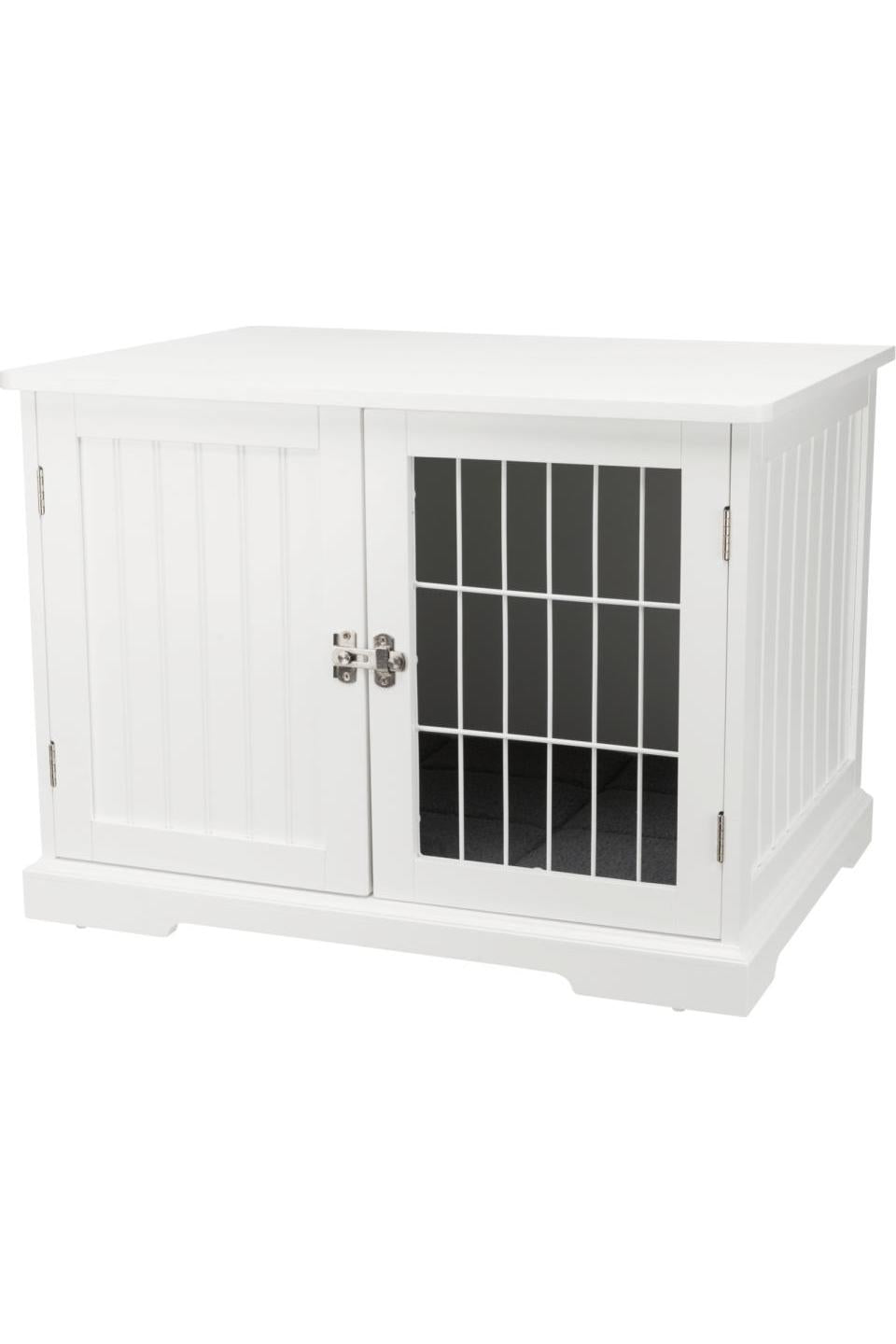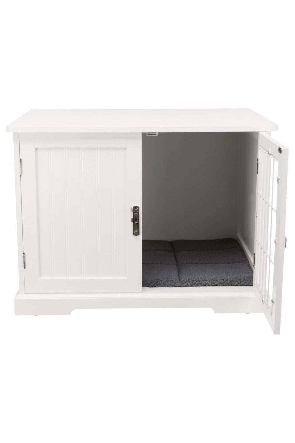 Et flott hjem for kjæledyret ditt. Home Kennel i hvitt er designet for både hunder og katter. Dette produktet egner seg som et kortvarig tilfluktssted hjemme. Den tilbyr en tilbaketrekningsplass og har en åpning i fronten. Home Kennel er utstyrt med metallgitter og en låsebolt for å ivareta sikkerheten. Burets innside har et lammeskinnslignende innlegg av polyester med skumfylling, og bunnen er sklisikker. Innlegget kan vaskes for hånd. Konstruksjonen av buret er laget av MDF og er lakkert for en attraktiv finish. Alt i alt er dette Home Kennel-buret et komfortabelt og trygt sted for korte opphold hjemme for kjæledyrene dine.