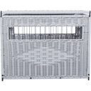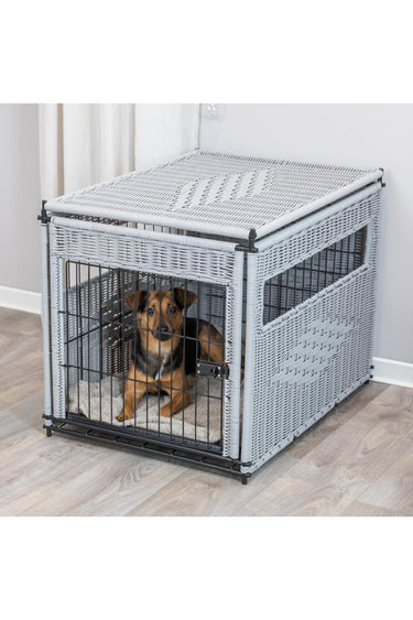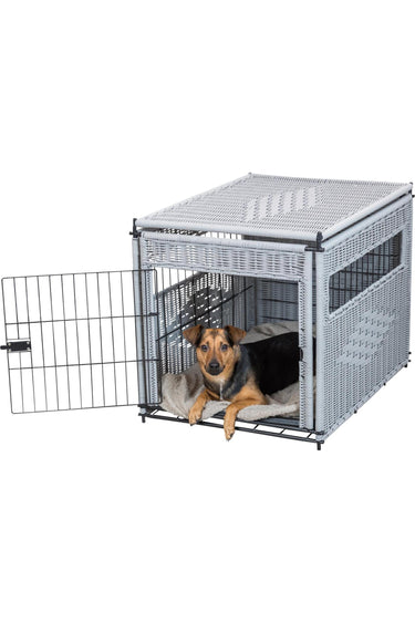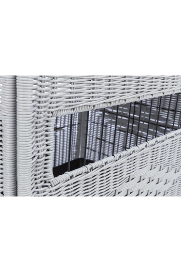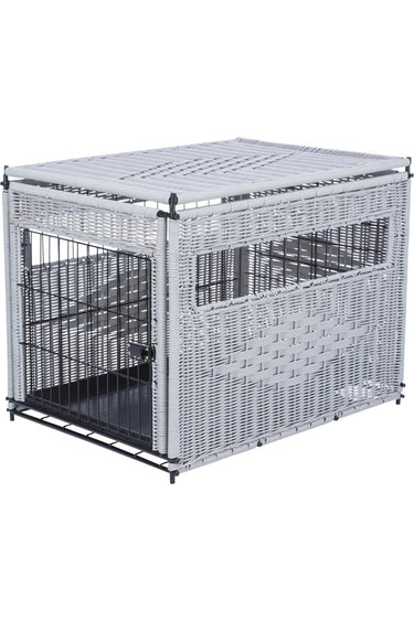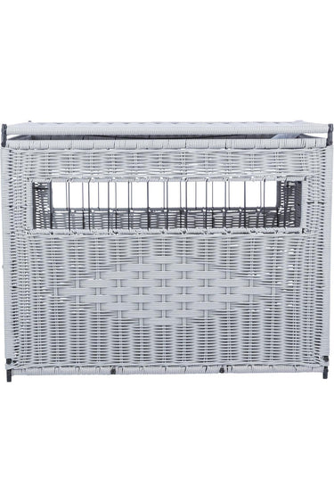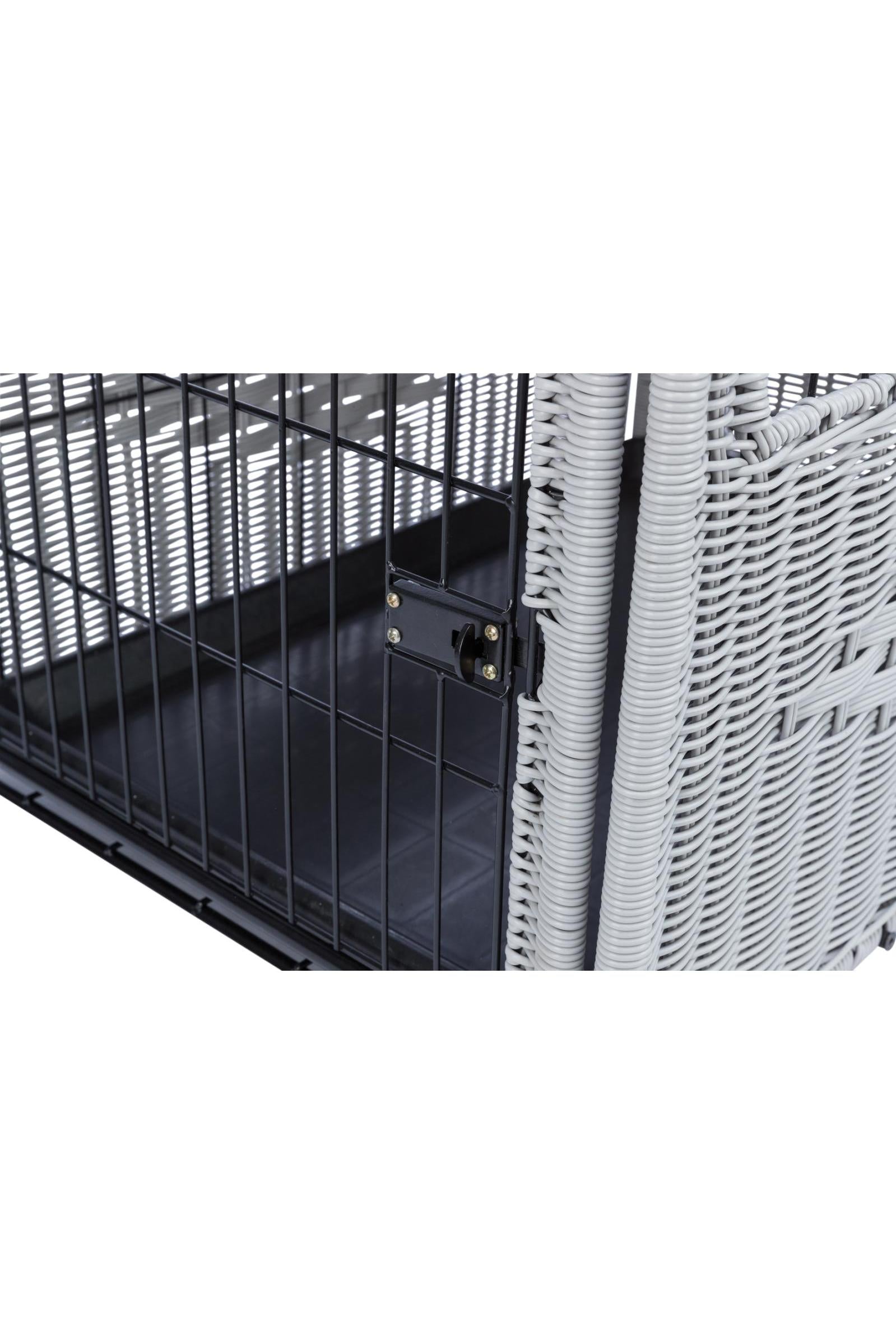 Home Kennel i størrelse M er laget av polyrattan og har en lysegrå farge. Den er ideell for kortvarig plassering i hjemmet, noe som gjør den egnet som et midlertidig hjem for kjæledyr. Kennelen kan åpnes forfra for enkel tilgang. Den er utstyrt med et metallgitter og en lås for å sikre et trygt miljø. Bunnbrettet er laget av plast (ABS), noe som gjør det enkelt å rengjøre. Designet i polyrotting gir kennelen et estetisk uttrykk som passer inn i hjemmet. Alt i alt tilbyr denne Home Kennel en kombinasjon av funksjonalitet og stil for kjæledyrets korttidsopphold hjemme.