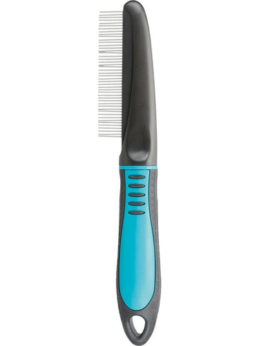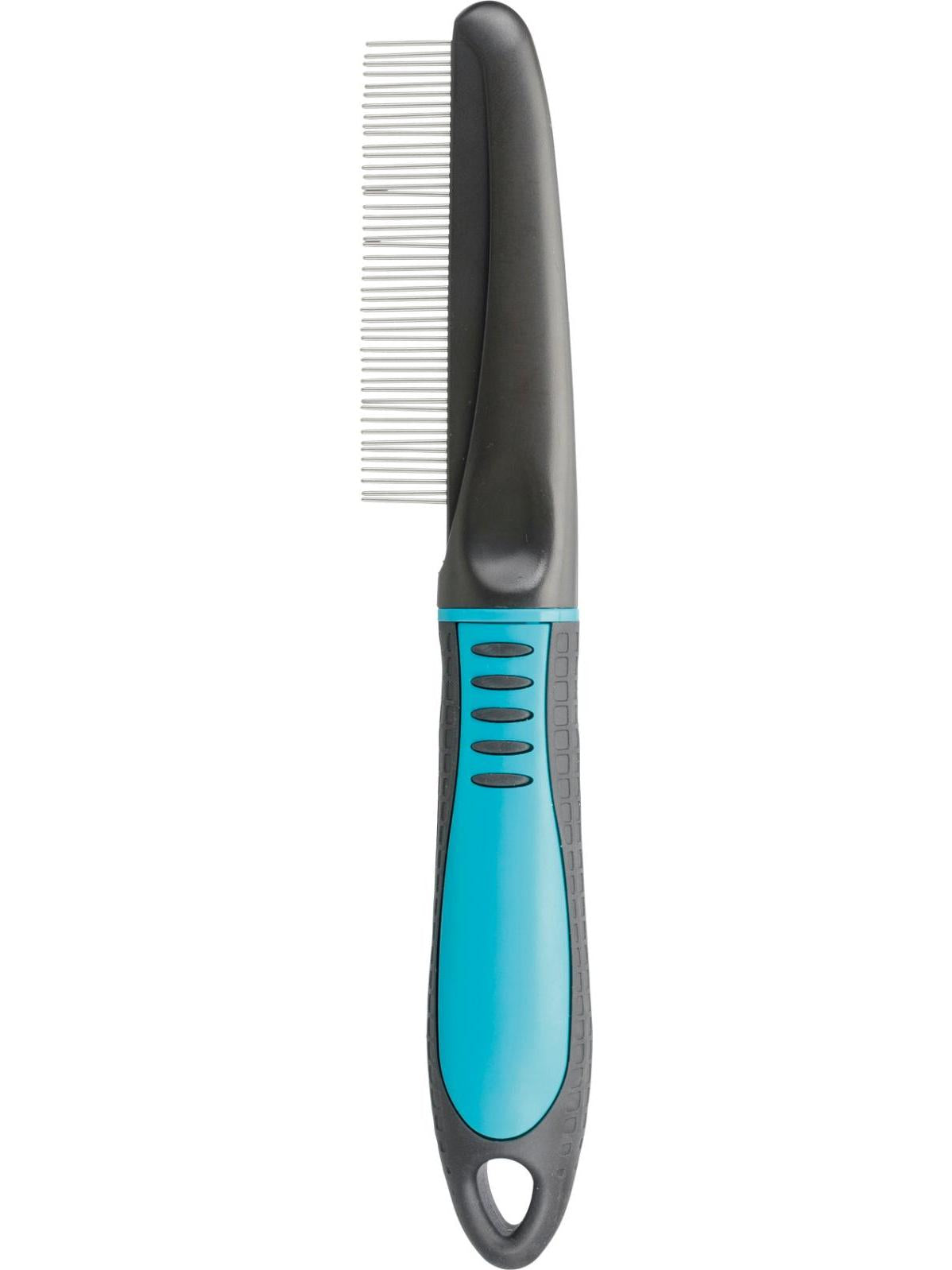 Kattkammen med roterende tenner er et allsidig verktøy for pelspleie. Den er utformet for å løsne og glatte ut både dekk- og underpels, slik at katten får en velstelt og skinnende pels. Kammens roterende tenner gjør det enkelt å gli gjennom pelsen uten å trekke eller irritere kattens hud. Den har et ergonomisk plasthåndtak med gummigrep som gir deg et komfortabelt og sikkert grep under bruk.