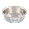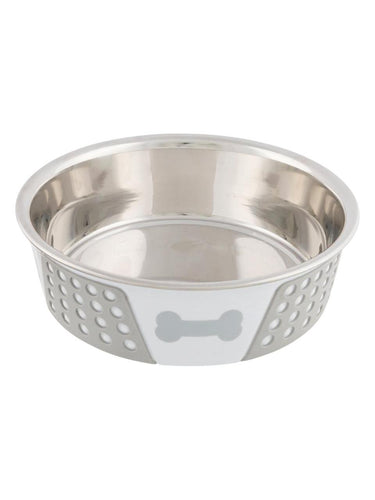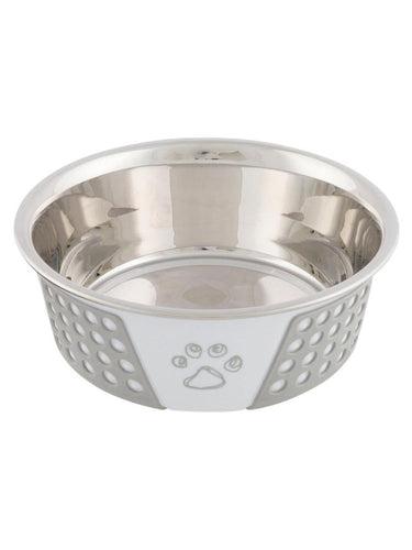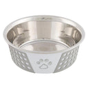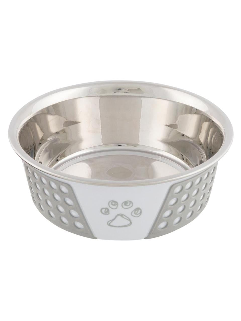 Skål i rustfritt stål med hvitt/grått silikoninnlegg. Skålen har også komponenter i plast og silikon. Den er designet med ulike motiver og har en sklisikker bunn takket være silikoninnlegget, noe som gjør at den ikke sklir rundt under bruk. Denne skålen er ideell til fôring av kjæledyret ditt, og den er enkel å rengjøre og vedlikeholde.