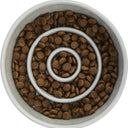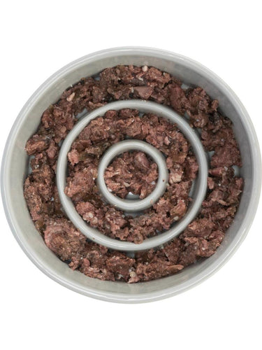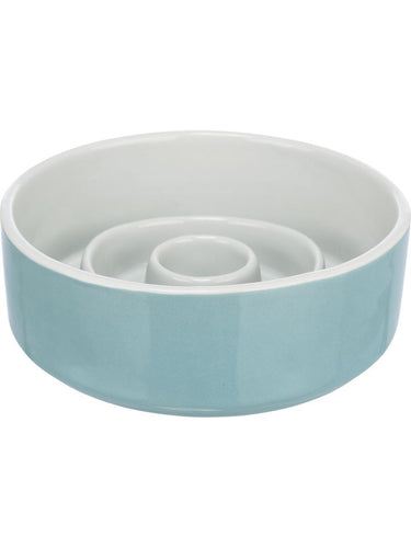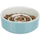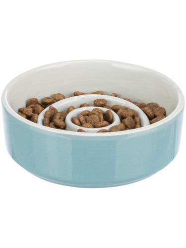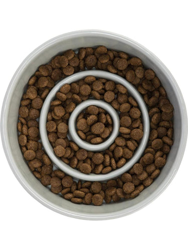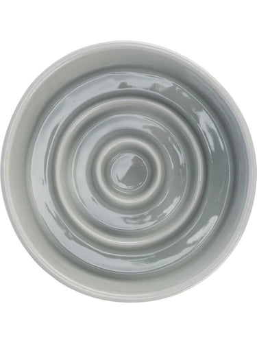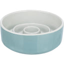 En Slow Feeding-skål i keramikk i grått og blått. Denne skålen er designet for å regulere hundens spisetempo og forhindre at den svelger maten for raskt. Den er konstruert med et mønster på bunnen som skaper hindringer, noe som gjør det vanskeligere for hunden å nå maten og tvinger den til å spise saktere. Denne keramikkskålen passer til alle typer hundemat, inkludert tørr-, våt- og blandingsfôr. Den keramiske konstruksjonen gjør den slitesterk og enkel å rengjøre, noe som er ideelt for daglig bruk. Fargekombinasjonen av grått og blått gir et stilig utseende som passer godt inn i de fleste hjem. Alt i alt er Slow Feeding-keramikkskålen en effektiv løsning for å fremme sunn spiseatferd hos hunder og sikre en mer kontrollert og behagelig spiseopplevelse..